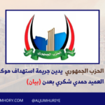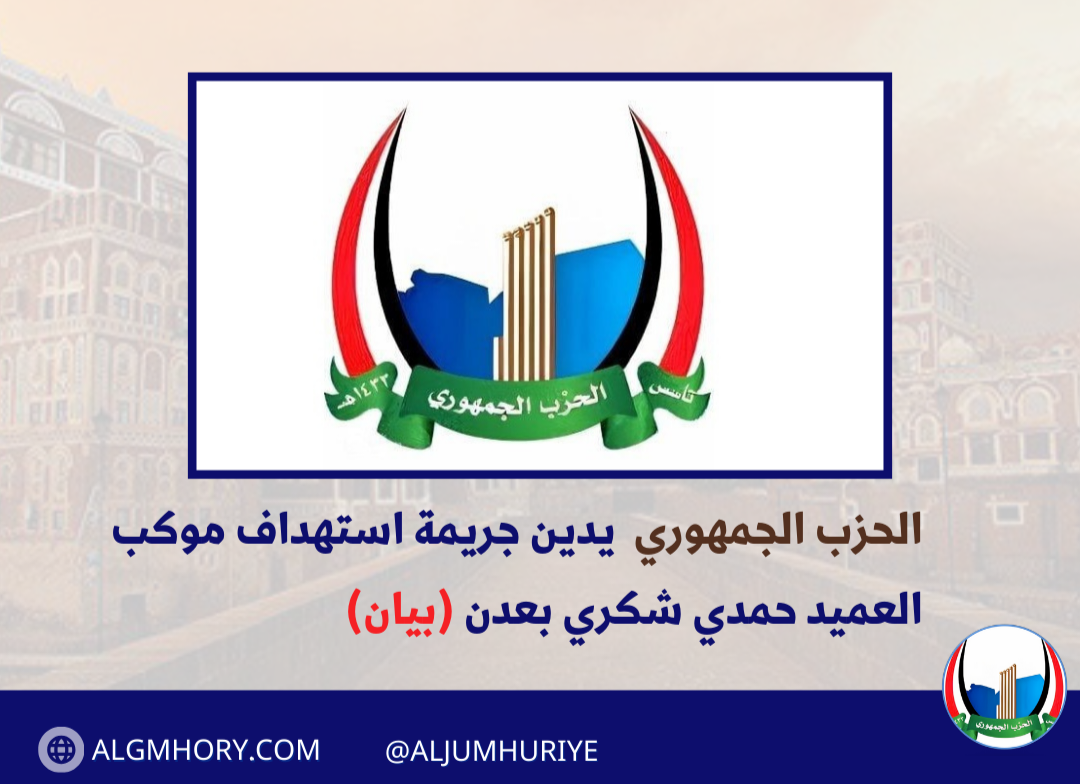 أدان الحزب الجمهوري اليمني، بأشد العبارات، العمل الإرهابي الجبان الذي استهدف موكب القيادي العسكري العميد حمدي شكري في مدينة عدن، وأسفر عن سقوط ضحايا من أفراد الحماية، معتبراً ذلك اعتداءً…