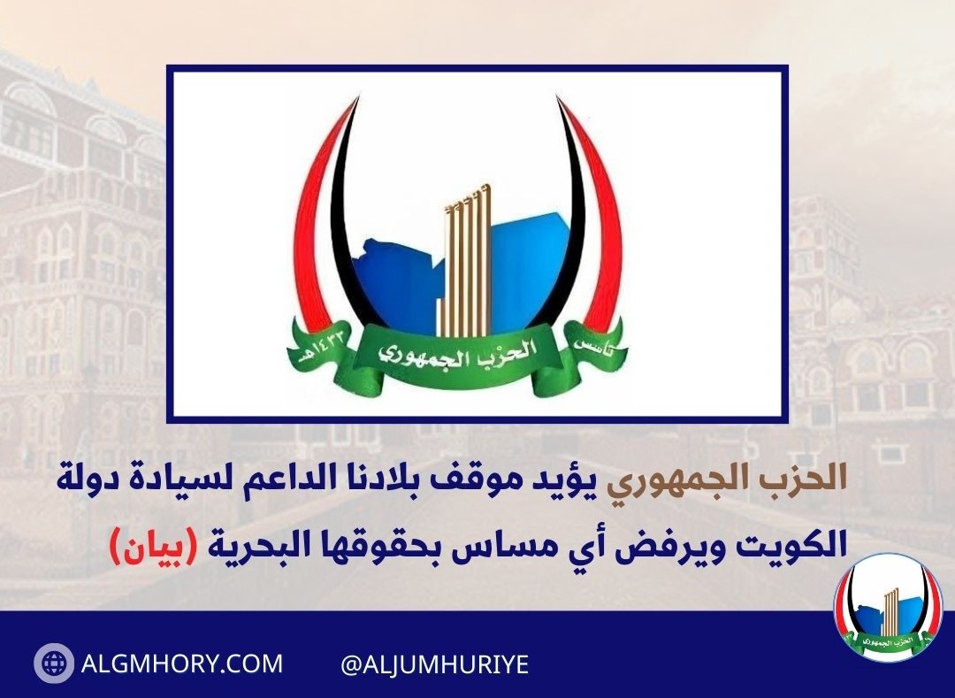 الثلاثاء 24 فبراير 2026 أعلن الحزب الجمهوري اليمني تأييده الكامل لموقف بلادنا المعبّر عنه من قبل وزارة الخارجية، إزاء التطورات المتعلقة بالإحداثيات والخرائط التي أودعتها جمهورية العراق لدى الأمم المتحدة،…