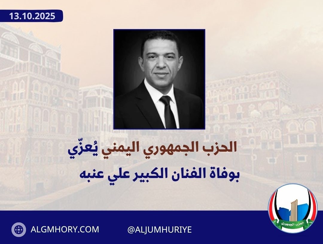 تقدم الحزب الجمهوري اليمني بأحر التعازي وصادق المواساة إلى أسرة الفنان الكبير علي عنبه وأبنائه وإخوانه، وإلى كافة محبيه وجمهوره في اليمن وخارجه، في وفاة هذا الصوت الأصيل الذي رحل في العاصمة المصرية القاهرة بعد مسيرة فنية حافلة بالعطاء والإبداع.