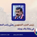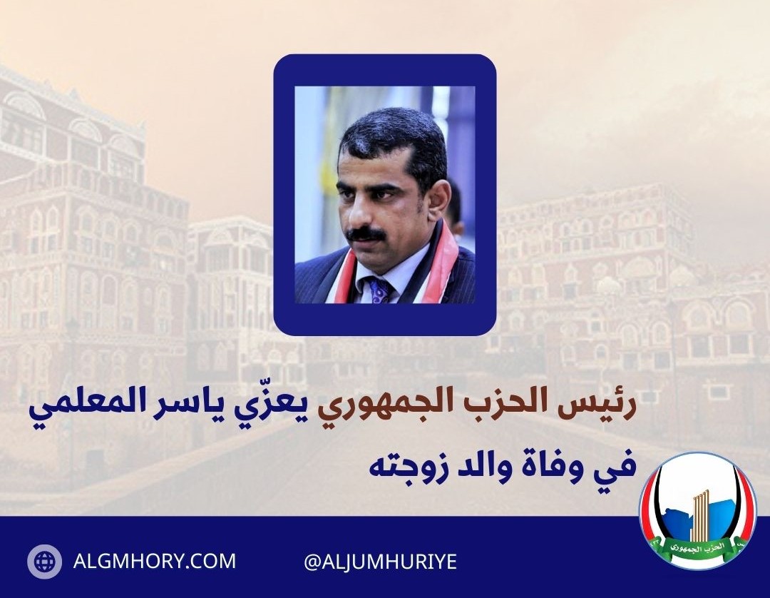 قدّم رئيس الحزب الجمهوري ووكيل وزارة الزراعة والري والثروة السمكية، المهندس محمد أحمد جزيلان، خالص تعازيه إلى الأستاذ ياسر أبو بكر المعلمي، رئيس الدائرة الإعلامية بالحزب الجمهوري، في وفاة والد زوجته الفاضلة، المغفور له بإذن الله المهندس علي سعيد العامري.