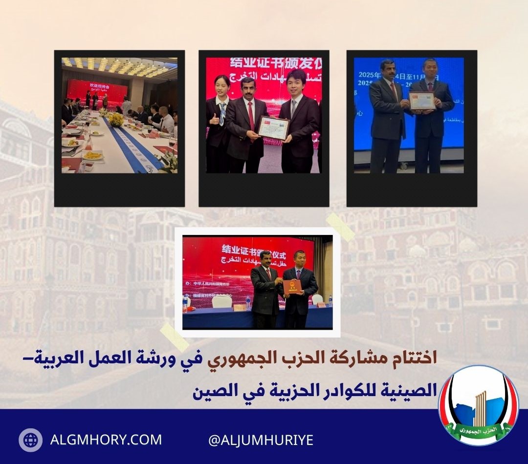 اختتم الحزب الجمهوري اليمني مشاركته في ورشة العمل العربية–الصينية للكوادر الحزبية والسياسية، التي استضافتها وزارة التجارة الصينية خلال شهر نوفمبر الجاري، وذلك بمشاركة وفود من عدة دول عربية.